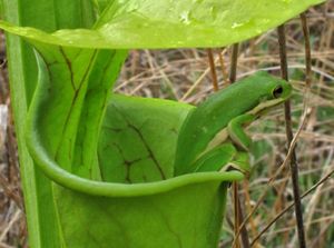 Green tree frog (Hyla cinerea) in a green pitcher plant (Sarracenia oreophila) at Coosa Bog Preserve, Alabama. © Alan Cressler