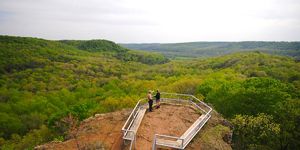 The 465-acre protected area is named for the turkey and black vultures (buzzards) frequently seen soaring above or roosting on the rock. This dolomitic outcrop towers 300 feet above the valley and provides habitat for a number of rare prairie plant species, including the plains muhlenbergia grass, which is classified as an endangered species in Ohio.
