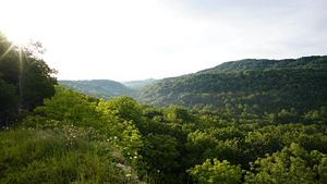 The most popular of all trails in the Edge of Appalachia Preserve System is the one that leads to Buzzardroost Rock, which stands like a giant limestone monument far above the waters of Ohio Brush Creek. The panoramic scene from this hilltop has been called Ohio’s most spectacular view.